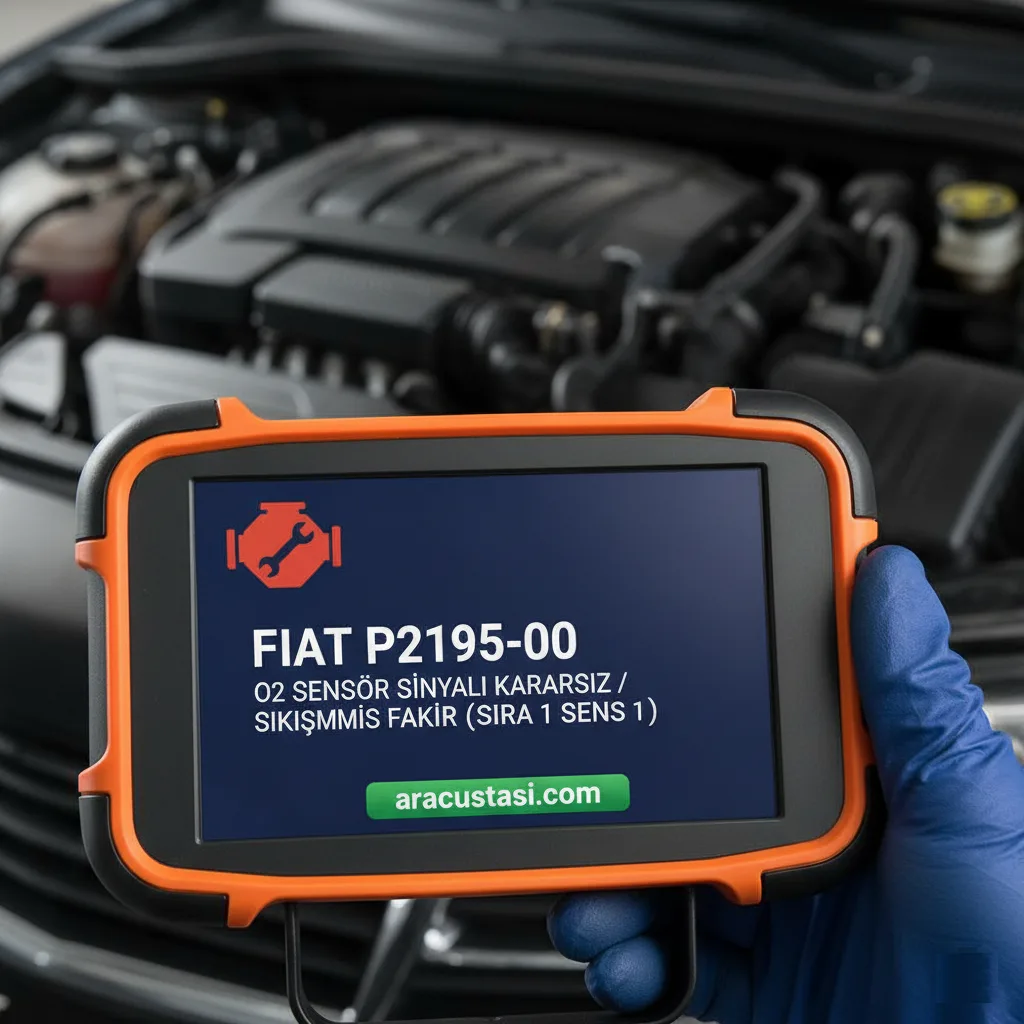 P2195-00, Fiat araçlarda “O2 Sensör Sinyali Kararsız / Sıkışmış Fakir (Sıra 1 Sensör 1)” anlamına gelir. Bu kod, motor kontrol modülünün upstream oksijen sensöründen gelen fakir yakıt karışımı sinyalini düzeltemediğini gösterir.