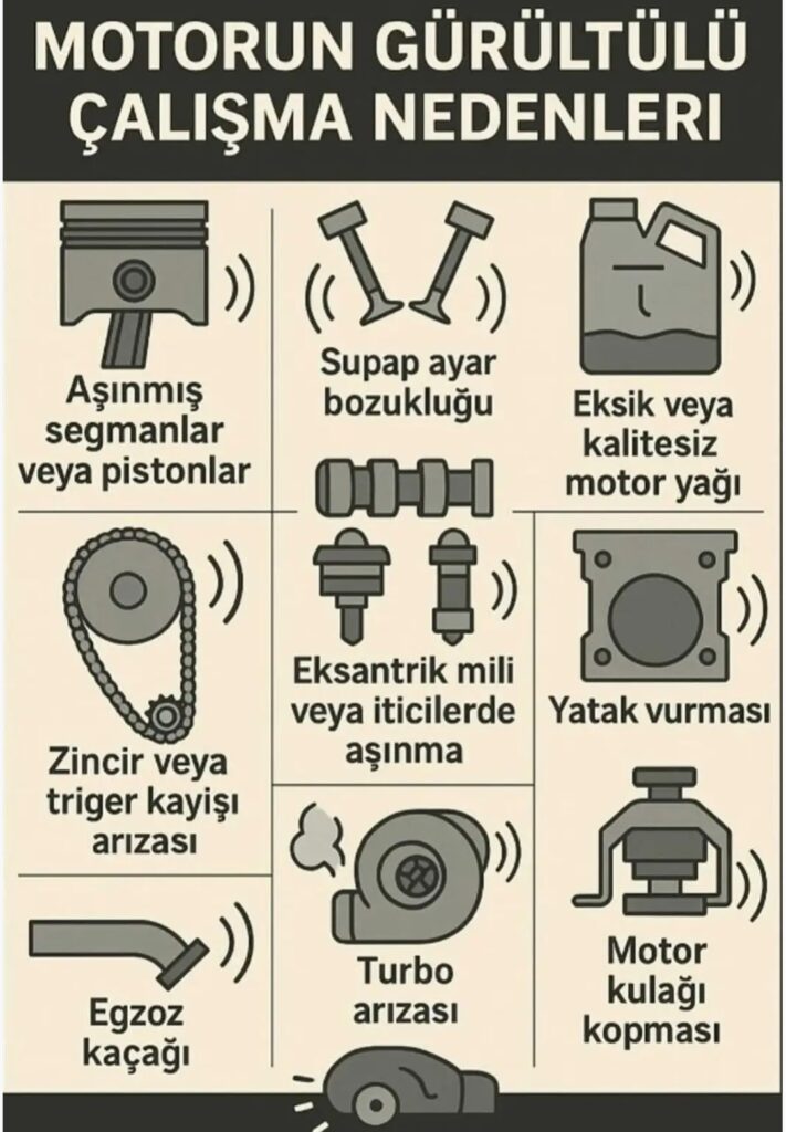 Motorun gürültülü çalışmasının pek çok nedeni olabilir. Bunlar arasında aşınmış segmanlar, supap ayar bozukluğu, düşük kaliteli motor yağı kullanımı, egzoz kaçağı ve turbo arızası yer alır.